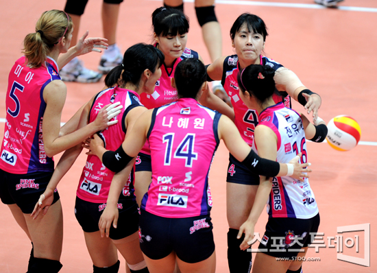 [인천=스포츠투데이 정재훈 기자] 22일 오후 인천 도원시립체육관에서 열린 'NH농협 2011-2012 V리그' 여자부 흥국생명과 도로공사의 경기에서 득점에 성공한 흥국생명 선수들이 함께 기뻐하고 있다.