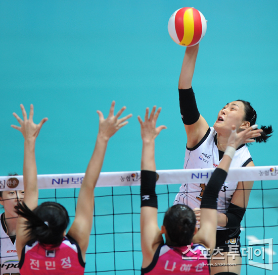 [인천=스포츠투데이 정재훈 기자] 22일 오후 인천 도원시립체육관에서 열린 'NH농협 2011-2012 V리그' 여자부 흥국생명과 도로공사의 경기에서 도로공사 임효숙이 스파이크를 때리고 있다.