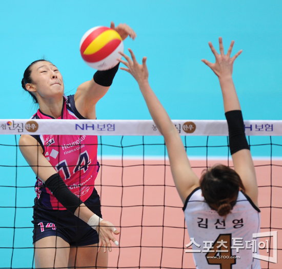 [인천=스포츠투데이 정재훈 기자] 22일 오후 인천 도원시립체육관에서 열린 'NH농협 2011-2012 V리그' 여자부 흥국생명과 도로공사의 경기에서 흥국생명 차혜원이 공격을 시도하고 있다.