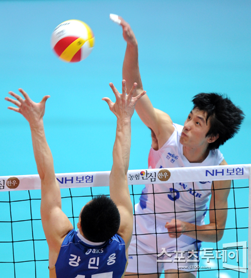 [인천=스포츠투데이 정재훈 기자] 22일 오후 인천 도원시립체육관에서 열린 'NH농협 2011-2012 V리그' 남자부 대한항공과 신협상무의 경기에서 대한항공 곽승석이 스파이크를 때리고 있다.