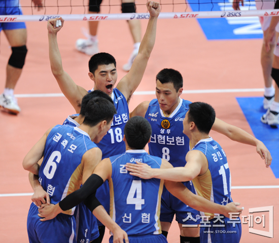 [인천=스포츠투데이 정재훈 기자] 22일 오후 인천 도원시립체육관에서 열린 'NH농협 2011-2012 V리그' 남자부 대한항공과 신협상무의 경기에서 득점에 성공한 상무 선수들이 환호하고 있다.