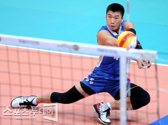 [인천=스포츠투데이 정재훈 기자] 22일 오후 인천 도원시립체육관에서 열린 'NH농협 2011-2012 V리그' 남자부 대한항공과 신협상무의 경기에서 상무 김진만이 리시브에 성공하고 있다.