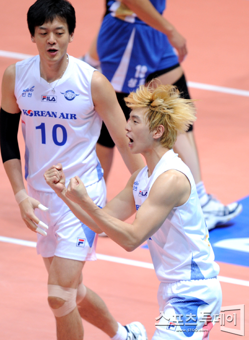 [인천=스포츠투데이 정재훈 기자] 22일 오후 인천 도원시립체육관에서 열린 'NH농협 2011-2012 V리그' 남자부 대한항공과 신협상무의 경기에서 블로킹에 성공한 한선수가 주먹을 쥐고 환호하고 있다.