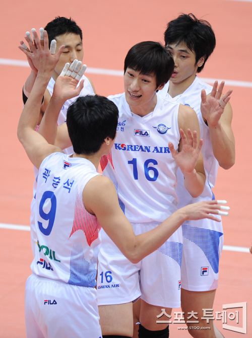 [인천=스포츠투데이 정재훈 기자] 22일 오후 인천 도원시립체육관에서 열린 'NH농협 2011-2012 V리그' 남자부 대한항공과 신협상무의 경기에서 공격에 성공한 진상헌이 동료들과 기뻐하고 있다.