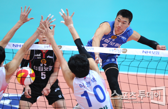 [인천=스포츠투데이 정재훈 기자] 22일 오후 인천 도원시립체육관에서 열린 'NH농협 2011-2012 V리그' 남자부 대한항공과 신협상무의 경기에서 김진만의 스파이크가 네트에 걸리고 있다.
