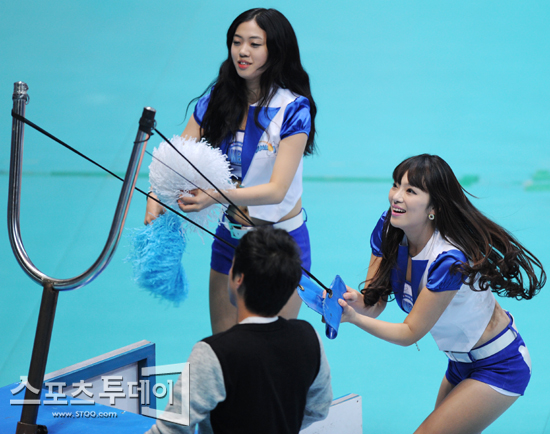 [인천=스포츠투데이 정재훈 기자] 22일 오후 인천 도원시립체육관에서 열린 'NH농협 2011-2012 V리그' 남자부 대한항공과 신협상무의 경기에서 치어리더들이 선물 증정 이벤트를 진행하고 있다.