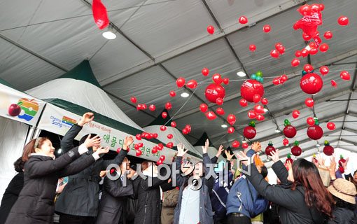 [아시아경제 윤동주 기자] 23일 서울 청계광장에서 열린 '3회 청계천 청송사과 페스티벌'에 참가한 시민들이 맛있는 청송사과가 하늘에서 떨어진다는 의미를 담은.