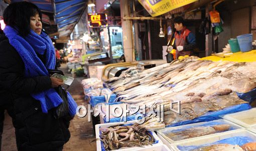 [아시아경제 양지웅 기자] 서울의 아침기온이 영하로 떨어지고 약한 눈발이 날리는 등 초겨울 날씨를 보인 23일 서울 종로구의 한 재래시장에서 한 주부가 생선을.