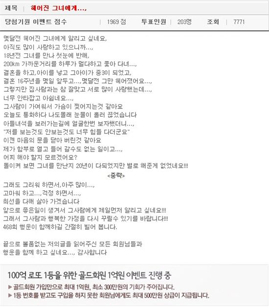 필명이 <te*******>인 이 회원은 “비록 헤어졌으나 그리워하고 고마워하며 앞으로도 최선을 다해 살아가겠다”면서 “로또에 당첨되는 것처럼 좋은 일이 생기면 그녀에게 가장 먼저 알리고 싶다”고 적었다.