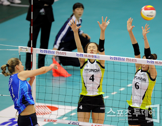 [수원=스포츠투데이 정재훈 기자] 30일 오후 수원실내체육관에서 열린 'NH 농협 2011-2012 V리그' 여자부 현대건설과 IBK 기업은행의 경기에서 알레시아가 스파이크를 때리고 있다.