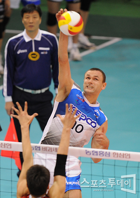 [수원=스포츠투데이 정재훈 기자] 30일 오후 수원실내체육관에서 열린 'NH 농협 2011-2012 V리그' 남자부 KEPCO45와 LIG 손해보험의 경기에서 안젤코가 공격을 시도하고 있다.