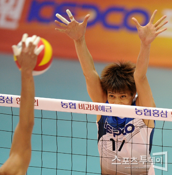 [수원=스포츠투데이 정재훈 기자] 30일 오후 수원실내체육관에서 열린 'NH 농협 2011-2012 V리그' 남자부 KEPCO45와 LIG 손해보험의 경기에서 하경민이 블로킹을 시도하고 있다.