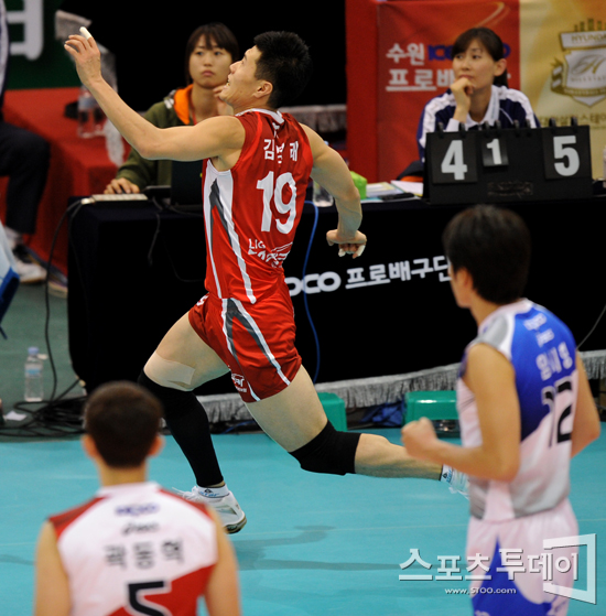 [수원=스포츠투데이 정재훈 기자] 30일 오후 수원실내체육관에서 열린 'NH 농협 2011-2012 V리그' 남자부 KEPCO45와 LIG 손해보험의 경기에서 LIG 손해보험 김영래가 공을 리시브하기 위해 KEPCO 45 진영 쪽으로 달리고 있다.