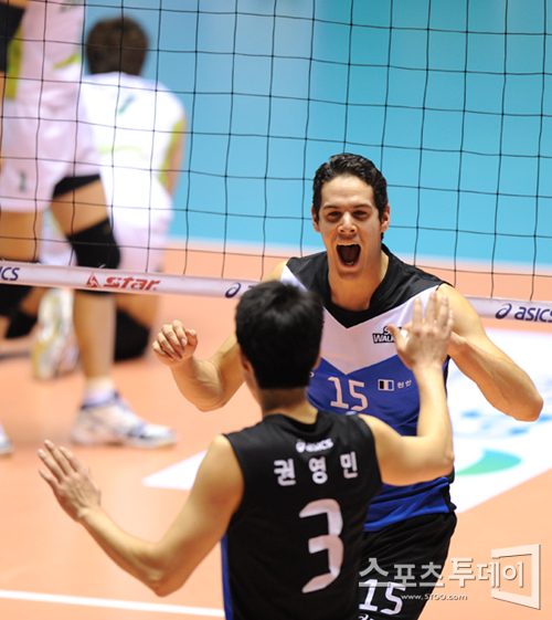 [스포츠투데이 정재훈 기자] 6일 오후 장충체육관에서 열린 'NH 농협 2011-2012 V리그' 남자부 드림식스와 현대캐피탈의 경기에서 득점에 성공한 수니아스가 환호하고 있다.