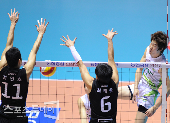 [스포츠투데이 정재훈 기자] 6일 오후 장충체육관에서 열린 'NH 농협 2011-2012 V리그' 남자부 드림식스와 현대캐피탈의 경기에서 최귀엽의 스파이크가 현대캐피탈 선수들의 블로킹에 막히고 있다.