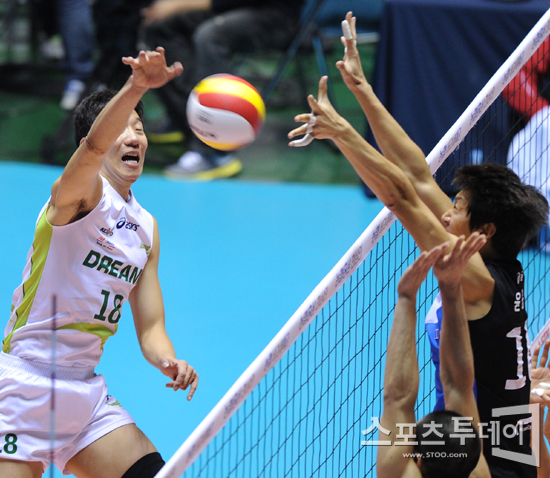 [스포츠투데이 정재훈 기자] 6일 오후 장충체육관에서 열린 'NH 농협 2011-2012 V리그' 남자부 드림식스와 현대캐피탈의 경기에서 신영석이 공격을 시도하고 있다.