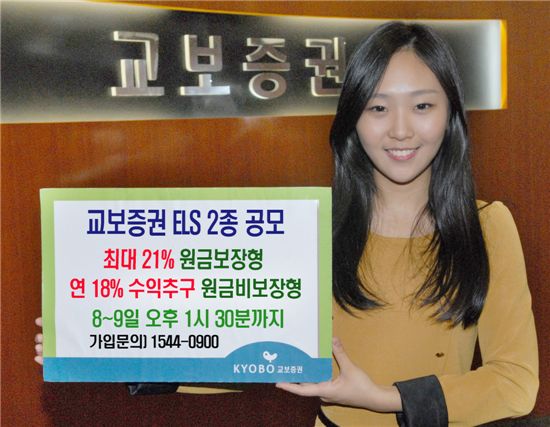 [아시아경제 지선호 기자] 교보증권 교보증권 close 증권정보 030610 KOSPI 현재가 14,080 전일대비 300 등락률 +2.18% 거래량 182,980 전일가 13,780 2026.04.23 15:30 기준 관련기사 코스콤, 교보증권과 ‘토큰증권 플랫폼 사업 추진’ 업무협약 체결 [특징주]증권주, 코스피·코스닥 상승에 동반 강세 교보증권, '청소년 불법도박 근절' 릴레이 캠페인 동참 (대표 김해준)은 9일에 최대 21%의 수익을 지급하면서 조기 지급이 가능한 원금보장형 ELS와 최초기준주가의 45%수준까지 하락하더라도 연 18%의 수익을 지급하는 원금비보장형 ELS를 각각 총 50억원(발행한도) 규모로 발행한다.