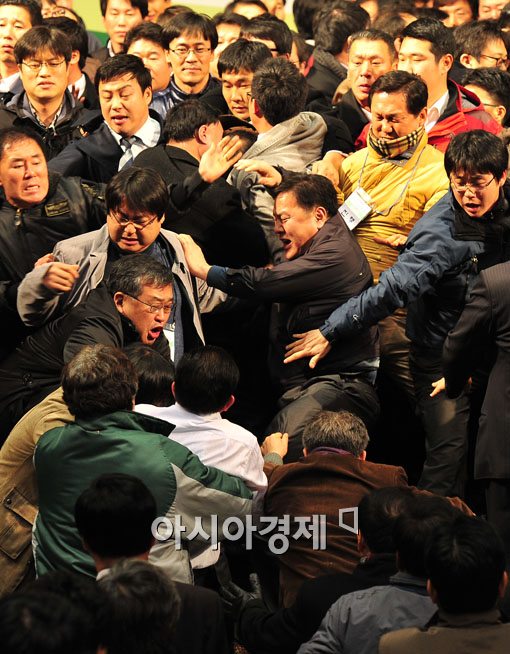 [아시아경제 윤동주 기자] 11일 서울 송파구 잠실실내체육관에서 열린 야권 통합결의를 위한 민주당 전국대의원대회에서 의결 정족수 부족 논란 속에서도 통합안을 가결시키자 통합 반대파 대의원들이 거칠게 항의하고 있다.