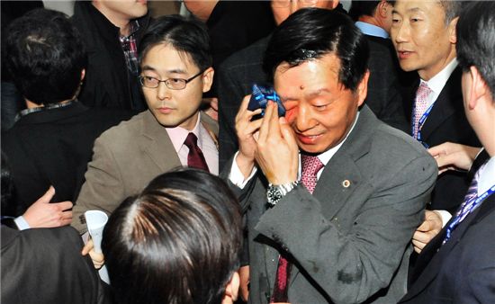 직선제를 원하는 일부 회원이 간선제를 유지하려는 현 집행부와 충돌했다. 흥분한 회원이 인사말 중인 경만호 의협회장(사진 오른쪽)에게 계란과 액젓을 던졌다. 일부 회원들은 발길질을 하기도 했다. 폭행을 당한 경 회장은 얼굴에 피를 흘려 인근 병원으로 옮겨 치료를 받았다.