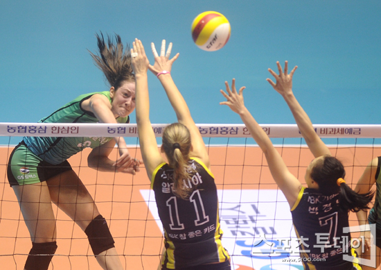 [스포츠투데이 정재훈 기자] 13일 오후 장충체육관에서 열린 'NH 농협 2011-2012 V리그' 여자부 GS칼텍스와 IBK기업은행의 경기에서 페리가 스파이크를 때리고 있다.