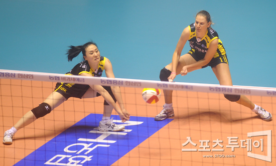 [스포츠투데이 정재훈 기자] 13일 오후 장충체육관에서 열린 'NH 농협 2011-2012 V리그' 여자부 GS칼텍스와 IBK기업은행의 경기에서 박경낭의 상대의 공격을 리시브하고 있다.