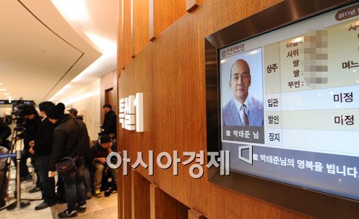 [아시아경제 양지웅 기자] 13일 오후 서울 신촌 세브란스병원에 마련된 故 박태준 포스코 명예회장의 빈소 앞에 취재진들이 몰려 있다. 포스코 창립자인 박태준 명예회장은 폐질환이 악화돼 연세 대 세브란스 병원 중환자실에 입원해 치료를 받아왔지만 상태가 악화돼 이날 84세의 나이로 별세했다.