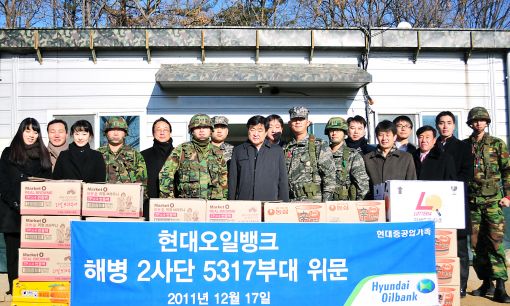 현대오일뱅크는 지난해 북한의 연평도 포격 도발로 전사한 해병 장병 유가족과 피해 주민들을 위해 임직원들이 주유소 현장 근무를 통해 모은 3600만원을 전달하고, 연평 지역 학교에 급식시설을 지원하는 등 해병대와 각별한 인연을 이어 오고 있다.