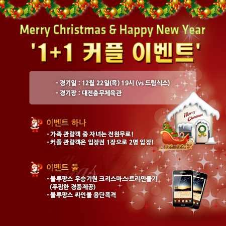 이날 경기장을 찾는 팬들을 대상으로 ‘1+1 커플이벤트’를 진행한다. 가족관람객은 동반한 자녀에 한해 무료입장이 가능하며 커플관람객은 입장권 1장으로 커플 2명의 입장이 가능하다. 경기 시작 전에는 선수들이 직접 100개의 사인볼을 팬들에게 나눠줄 예정이다. 또한 우승을 기원하는 메시지를 크리스마스트리에 걸고 팬들과 하나 되는 시간도 준비했다.