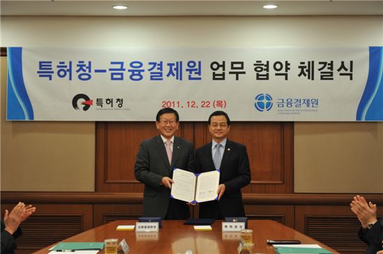 [아시아경제 왕성상 기자] 특허청(청장 이수원)과 금융결제원(원장 송창헌)은 국내 금융·지급결제산업 발전과 지식재산권 보호, 활성화를 위해 22일 특허관련 업무협약을 맺었다.