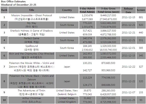 South Korea's box office estimates for the weekend of December 23-25, 2011 [Korean Box Office Information System (KOBIS)]