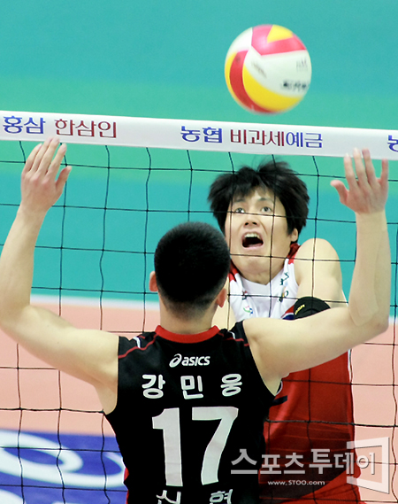 [수원=스포츠투데이 정재훈 기자] 27일 오후 수원실내체육관에서 열린 'NH 농협 2011-2012 V리그' 남자부 KEPCO와 신협상무의 경기에서 하경민이 상대의 공격을 받아내고 있다.
