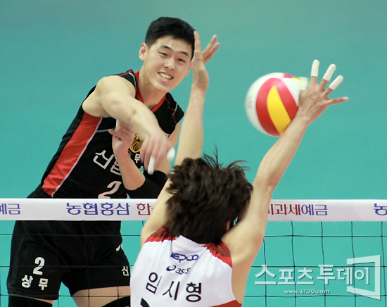 [수원=스포츠투데이 정재훈 기자] 27일 오후 수원실내체육관에서 열린 'NH 농협 2011-2012 V리그' 남자부 KEPCO와 신협상무의 경기에서 조용욱의 스파이크가 임시형의 손을 스치고 있다.