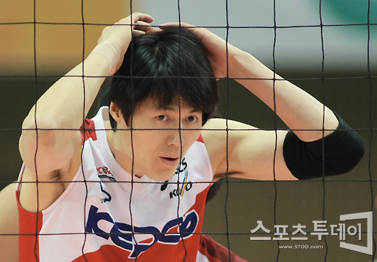 [수원=스포츠투데이 정재훈 기자] 27일 오후 수원실내체육관에서 열린 'NH 농협 2011-2012 V리그' 남자부 KEPCO와 신협상무의 경기에서 상대 진영을 응시하는 하경민.