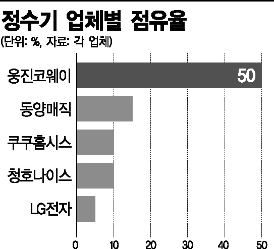 이 회사의 월 판매 대수는 올해 들어 1만5000대로 늘었다. 쿠쿠는 지난 7월 "정수기 사업 진출 2년 만에 업계 2위로 올라섰다"고 밝히기도 했다. 현재 정수기 시장은 1조5000억원 규모로 추정되는데 점유율 48%인 웅진코웨이가 1위다.