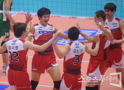 [성남=스포츠투데이 정재훈 기자] 31일 오후 성남실내체육관에서 열린 'NH 농협 2011-2012 V리그' KEPCO와 드림식스의 경기에서 공격을 성공시킨 서재덕이 동료들과 기뻐하고 있다.