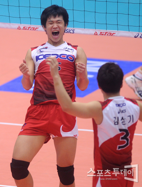 [성남=스포츠투데이 정재훈 기자] 31일 오후 성남실내체육관에서 열린 'NH 농협 2011-2012 V리그' KEPCO와 드림식스의 경기에서 공격에 성공한 서재덕이 동료들과 기뻐하고 있다.