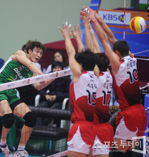 [성남=스포츠투데이 정재훈 기자] 31일 오후 성남실내체육관에서 열린 'NH 농협 2011-2012 V리그' KEPCO와 드림식스의 경기에서 최홍석이 블로킹을 뚫고 공격을 성공시키고 있다.