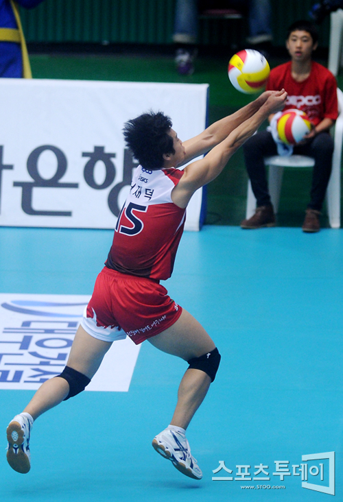 [성남=스포츠투데이 정재훈 기자] 31일 오후 성남실내체육관에서 열린 'NH 농협 2011-2012 V리그' KEPCO와 드림식스의 경기에서 몸을 날려 공을 받아내는 서재덕.