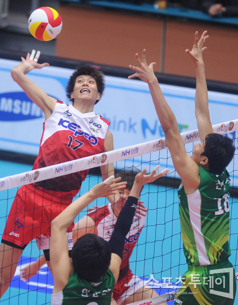 [성남=스포츠투데이 정재훈 기자] 31일 오후 성남실내체육관에서 열린 'NH 농협 2011-2012 V리그' KEPCO와 드림식스의 경기에서 공격을 시도하는 하경민.
