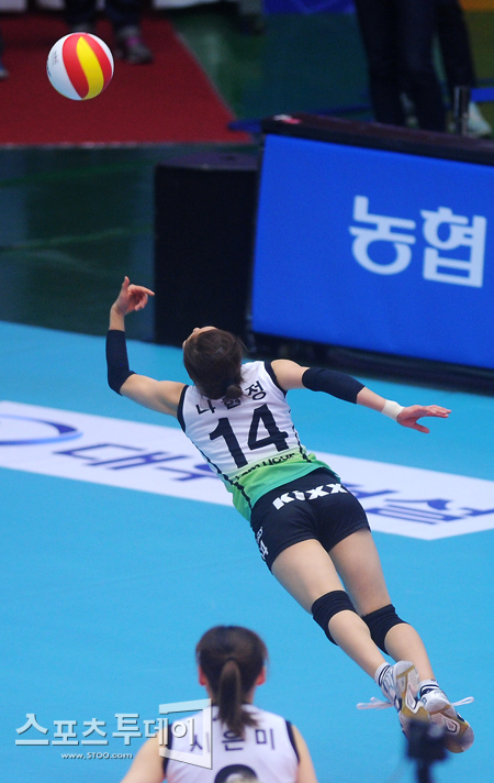 [성남=스포츠투데이 정재훈 기자] 31일 오후 성남실내체육관에서 열린 'NH 농협 2011-2012 V리그' 여자부 현대건설과 GS칼텍스의 경기에서 나현정이 몸을 던져 공을 쫓고 있다.