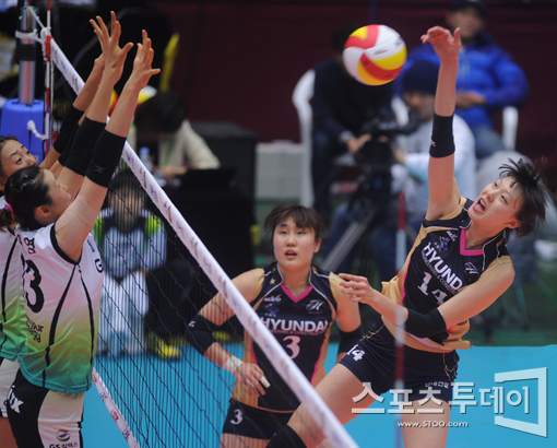 [성남=스포츠투데이 정재훈 기자] 31일 오후 성남실내체육관에서 열린 'NH 농협 2011-2012 V리그' 여자부 현대건설과 GS칼텍스의 경기에서 양효진이 공격을 시도하고 있다.