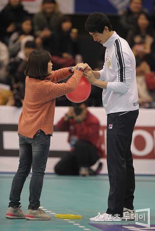 [수원=스포츠투데이 정재훈 기자] 8일 오후 수원실내체육관에서 열린 'NH 농협 2011-2012 V리그 올스타전'에서 명랑운동회에 참가한 박철우가 팬과 포옹을 준비하고 있다.