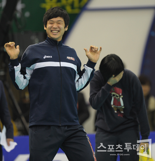 [수원=스포츠투데이 정재훈 기자] 8일 오후 수원실내체육관에서 열린 'NH 농협 2011-2012 V리그 올스타전'에서 명랑운동회에 참가한 KEPCO 서재덕이 댄스를 선보이고 있다.