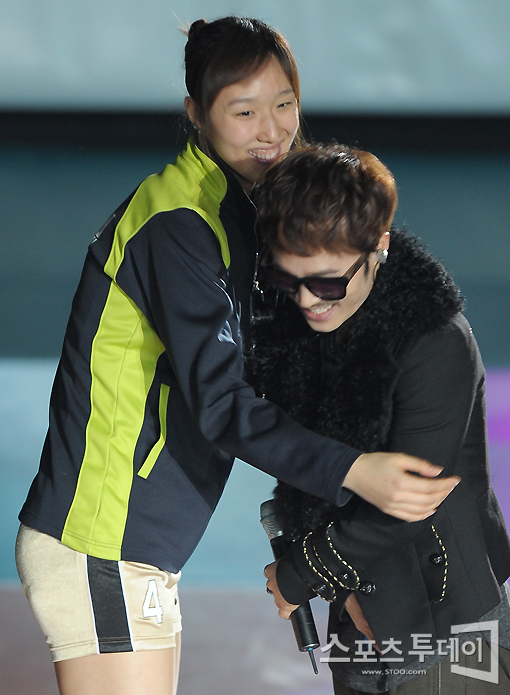 [수원=스포츠투데이 정재훈 기자] 8일 오후 수원실내체육관에서 열린 'NH 농협 2011-2012 V리그 올스타전'에서 축하공연을 펼친 슈퍼스타K3 우승자 울랄라세션 김명훈이 황연주와 포옹을 나누고 있다.