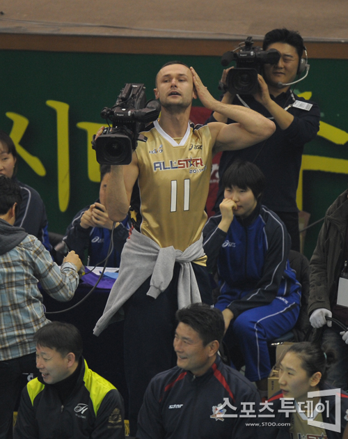 [수원=스포츠투데이 정재훈 기자] 8일 오후 수원실내체육관에서 열린 'NH 농협 2011-2012 V리그 올스타전'에서 카메라맨으로 등장한 안젤코가 힘들다는 제스쳐를 취하고 있다.