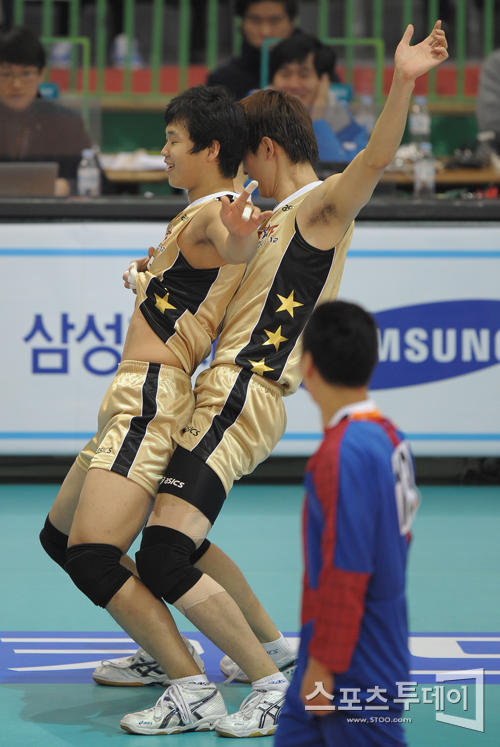 [수원=스포츠투데이 정재훈 기자] 8일 오후 수원실내체육관에서 열린 'NH 농협 2011-2012 V리그 올스타전'에서 득점에 성공한 서재덕이 동료와 불장난 댄스를 추고 있다.