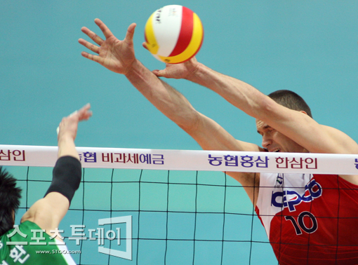 [수원=스포츠투데이 정재훈 기자] 22일 오후 수원실내체육관에서 열린 'NH 농협 2011-2012 V리그' KEPCO와 드림식스의 경기에서 안젤코가 블로킹을 시도하며 표정을 찡그리고 있다.