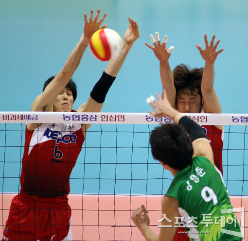 [수원=스포츠투데이 정재훈 기자] 22일 오후 수원실내체육관에서 열린 'NH 농협 2011-2012 V리그' KEPCO와 드림식스의 경기에서 방신봉이 블로킹을 시도하고 있다.