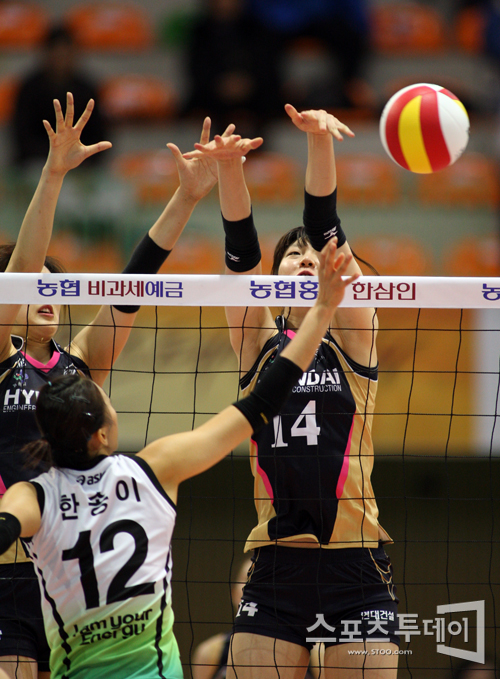 [수원=스포츠투데이 정재훈 기자] 22일 오후 수원실내체육관에서 열린 'NH 농협 2011-2012 V리그' 현대건설과 GS칼텍스의 경기에서 한송이가 스파이크를 때리고 있다.