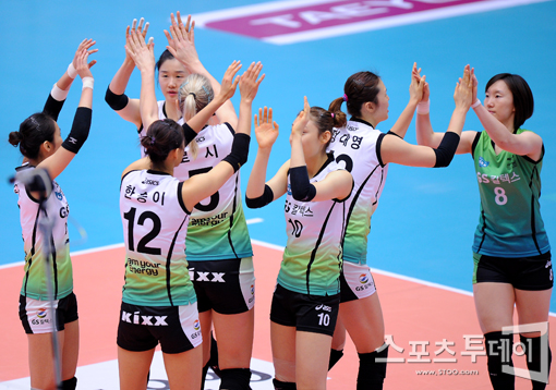 [성남=스포츠투데이 정재훈 기자] 25일 오후 성남실내체육관에서 열린 'NH 농협 2011-2012 V리그' 여자부 도로공사와 GS칼텍스의 경기. 경기 전 하이파이브 하며 결의를 다지는 GS칼텍스 선수들.